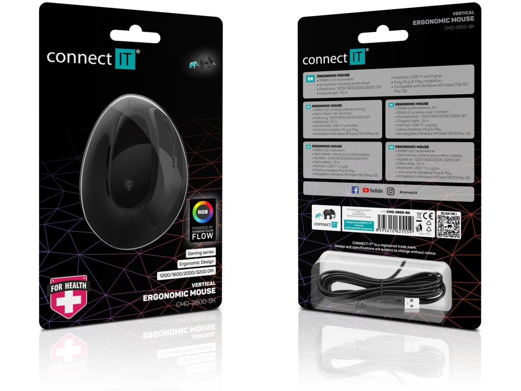 CONNECT IT GAME FOR HEALTH RGB ergonomická vertikální myš, drátová, černá CMO-2800-BK